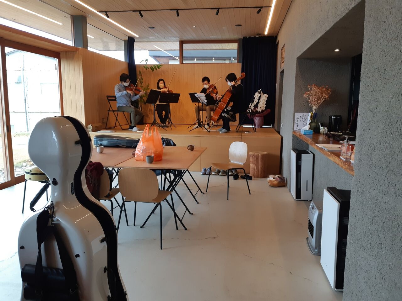 2022年12月9日 弦楽四重奏クリスマスコンサート・リハーサル② 噺館での「弦楽四重奏クリスマスコンサート」のリハーサル②。チェロケースが聴いています。演奏者の皆さんの今日の会話、「ようやく終わりが見えてきたね。あと1回のリハーサルで何とかなるでしょう。」ですって。こうやって、一から音をつくりあげていくんだなあー。コンサートが益々楽しみになってきた。 前へ 次へ