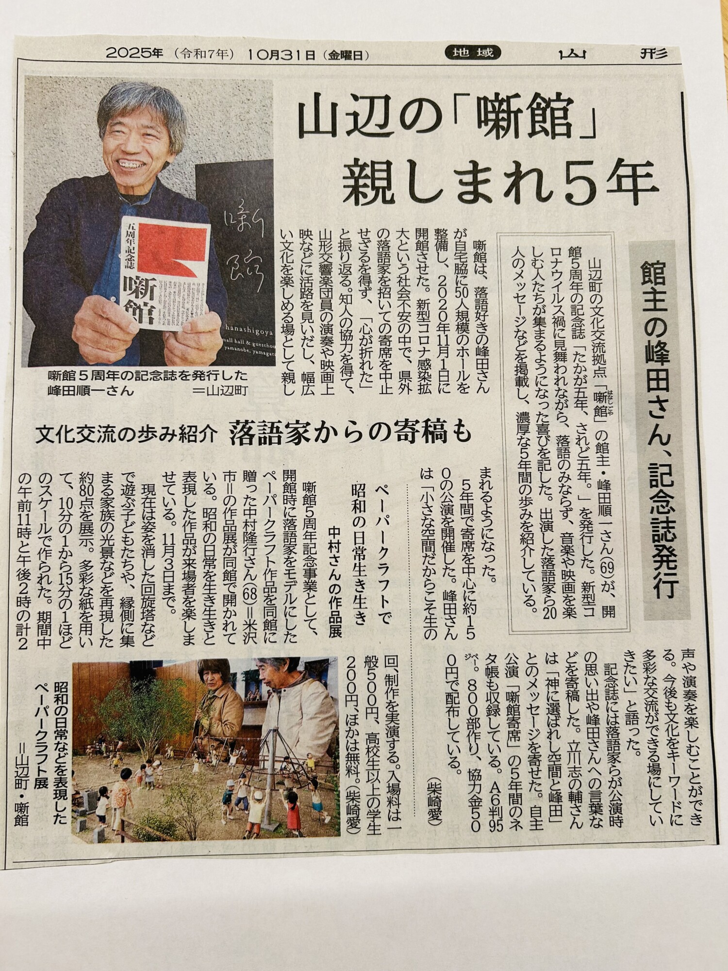 昨日の山形新聞(10.31)に、噺館5周年記念誌並びに記念事業「中村隆行 ペーパークラフト展」(10/28~11/3)を、取り上げていただきました。うれしっー!