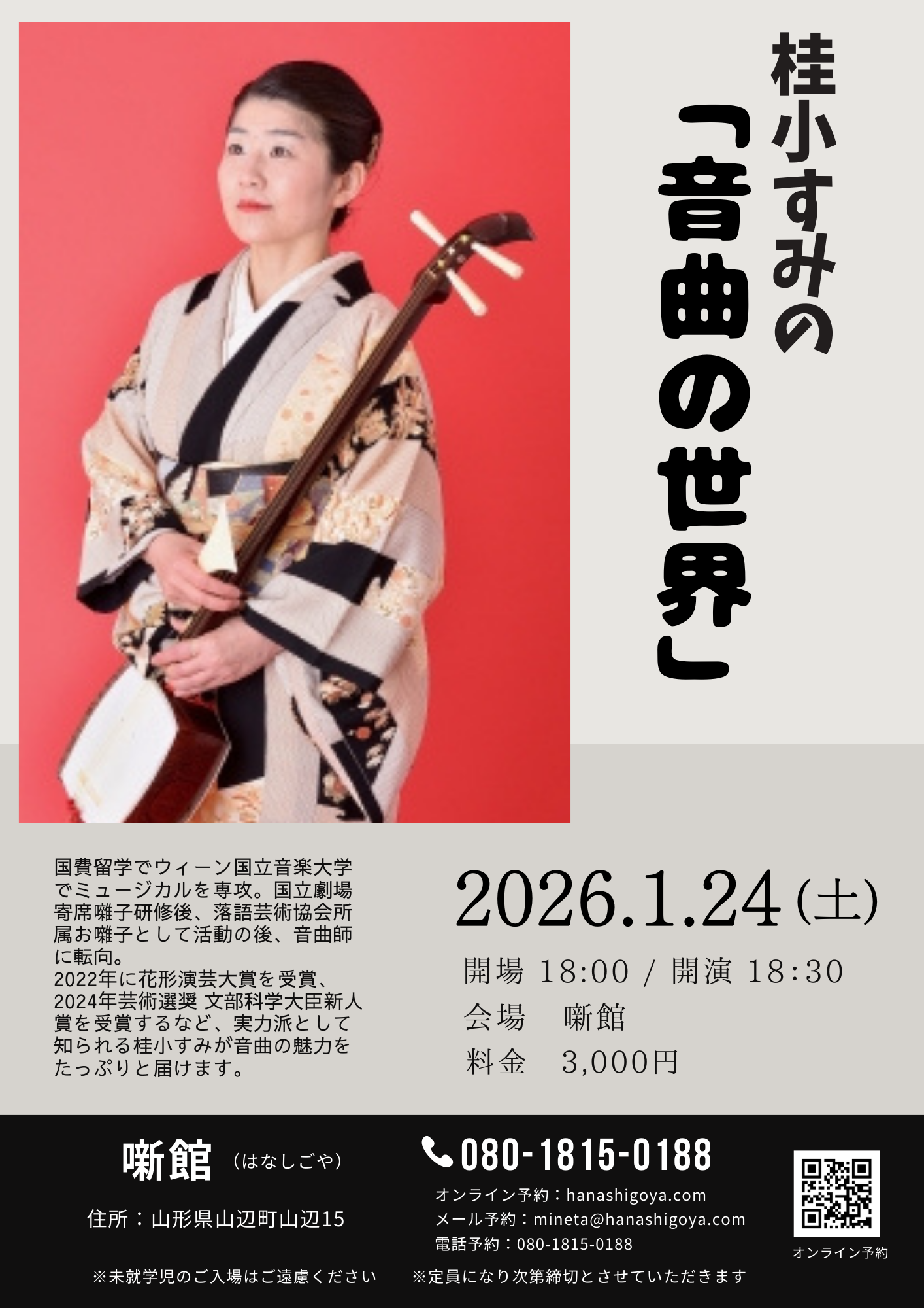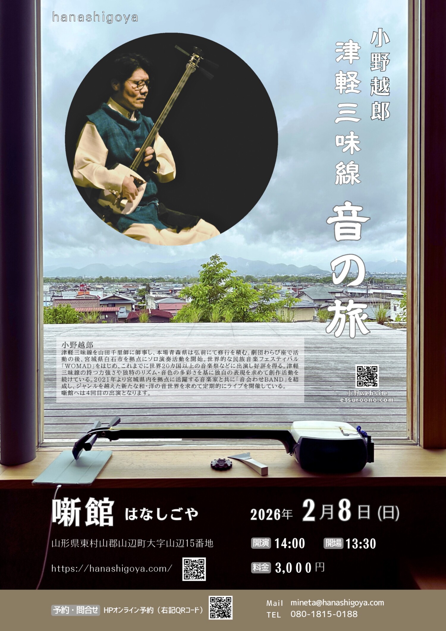 2025年12月19日 1月・2月の催しをUPしました 冬季間の催しは、どうしても雪が心配。 最近の雪は降ったとなるとドバッと降り続くので、駐車場の除雪も間に合わなくなります。 そんな心配から催しを企画するのを躊躇していましたが、HPの催し物に、1月24日(土) 桂小すみの「音曲の世界」2月8日(日) 小野越郎 津軽三味線 音の旅2月21日(土) 桂竹千代独演会をUPしましたので、どうぞご覧ください。 前へ 次へ