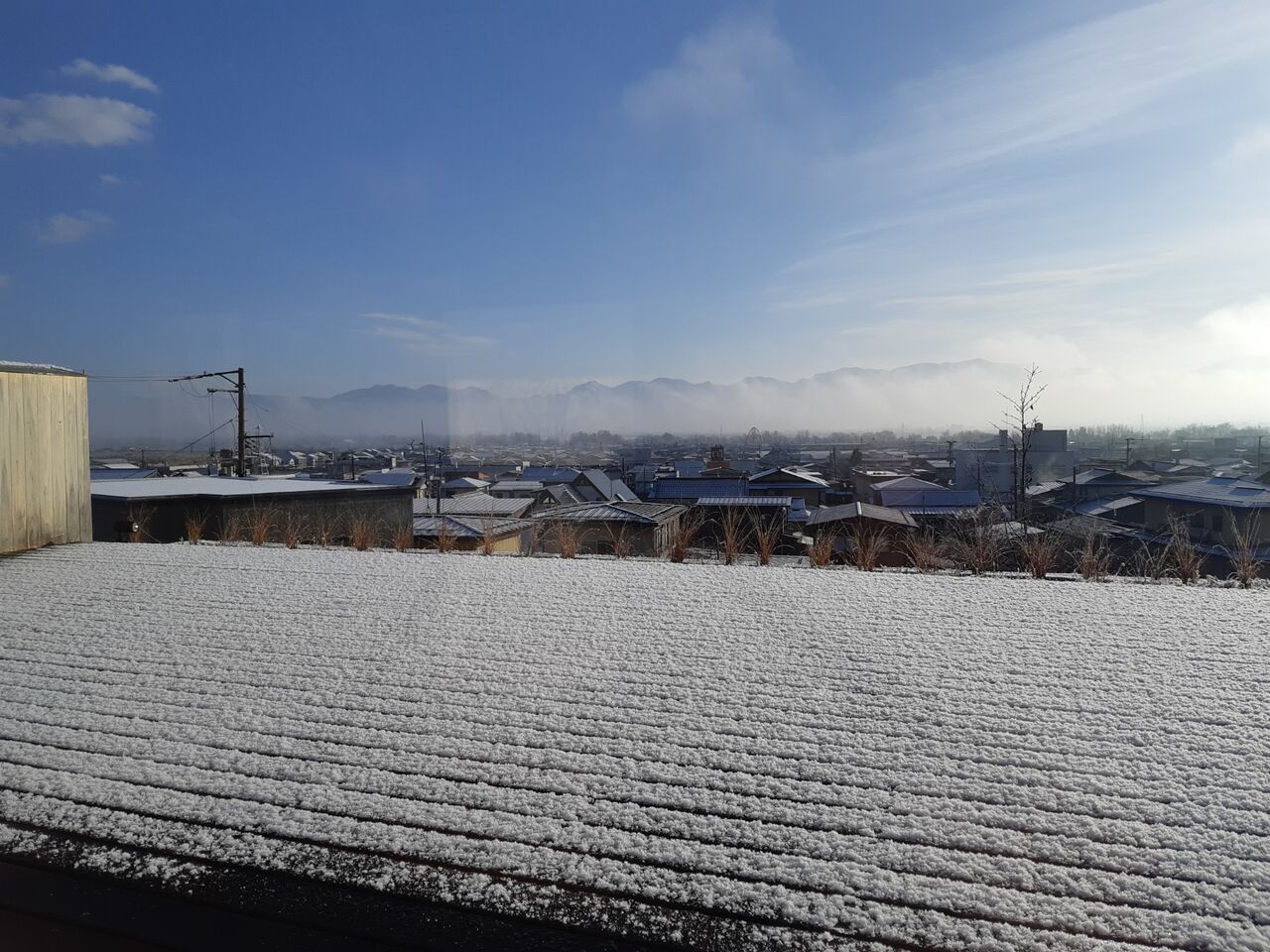 12月2日(金)、初雪。翌日朝の噺館2階のテラスです。