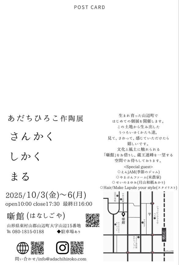 2025年10月1日 あだちひろこ作陶展、いよいよ 今週末の噺館は、山辺町出身の陶芸作家「あだちひろこ作陶展」です。私とひろこさんの出会いは、ふるさと資料館で「ひなミュージアム」を開催した時。さまざまなアーティストの方に独創的なお雛様を創ってもらい一堂に展示した。その時のひろこさんの作品がこちら。最近購入したコーヒーカップもステキです。 ぜひこの機会に、ひろこさんの陶芸の世界を覗きに来てください。 前へ 次へ