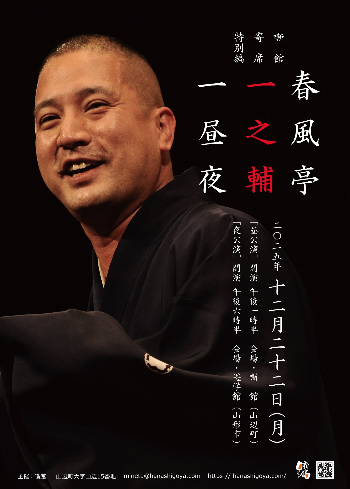 2025年10月17日 一之輔一昼夜 明日販売開始 いよいよ明日、18日の9:00〜12:00、「春風亭一之輔一昼夜」(12/22)チケットの一般販売開始です。明日の昼(噺館)•夜(遊学館)公演の販売は時間限定で、山辺町民総合体育館入口付近にて販売します。(午前7時より整理券発行予定)明後日19日以降は、店頭販売(八文字屋プール)とオンライン販売となりますが、18日の残券の販売となりますのでご了承ください。 前へ 次へ