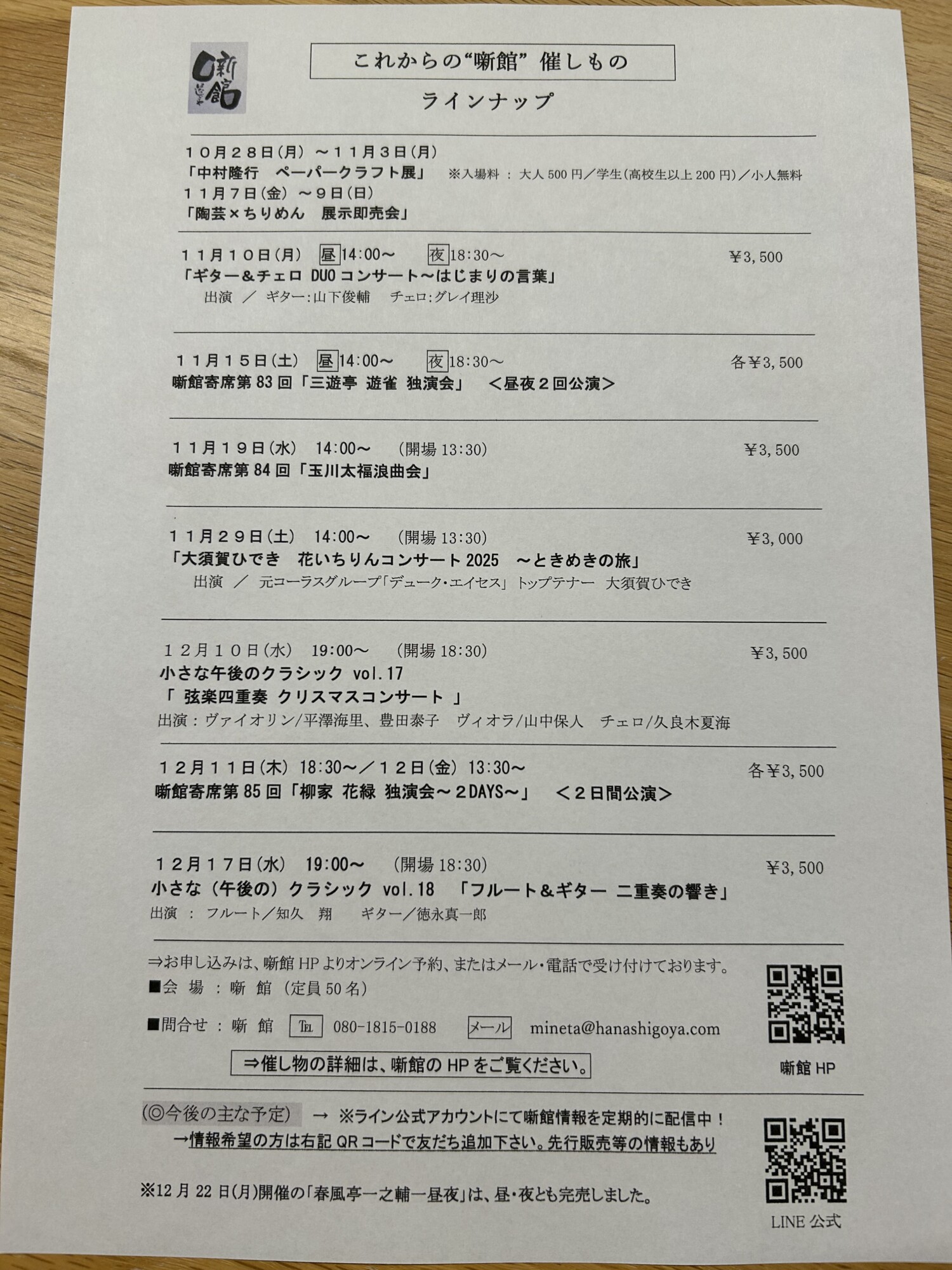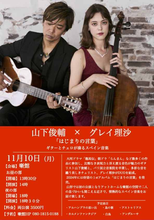 2025年11月9日 12月までのラインナップ ご来場ありがとうございました。 3日間の「陶芸×ちりめん 展示即売会」が、終了しました。 これからの噺館では、落語やコンサートの催しが続いていきます。 12月までの噺館ラインナップは、こちらです。↓明日11月10日(月)は、ギターとチェロが奏でるスペイン音楽、山下俊輔×グレイ理沙「はじまりの言葉」〈昼夜2回公演〉を開催します。 晩秋のひとときを、素敵な音楽でどうぞ! 前へ 次へ