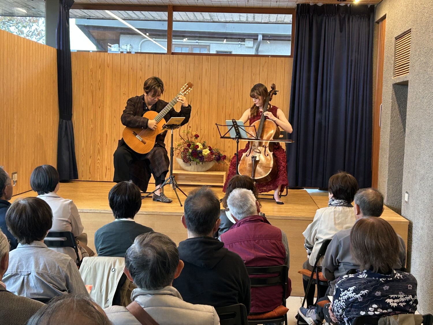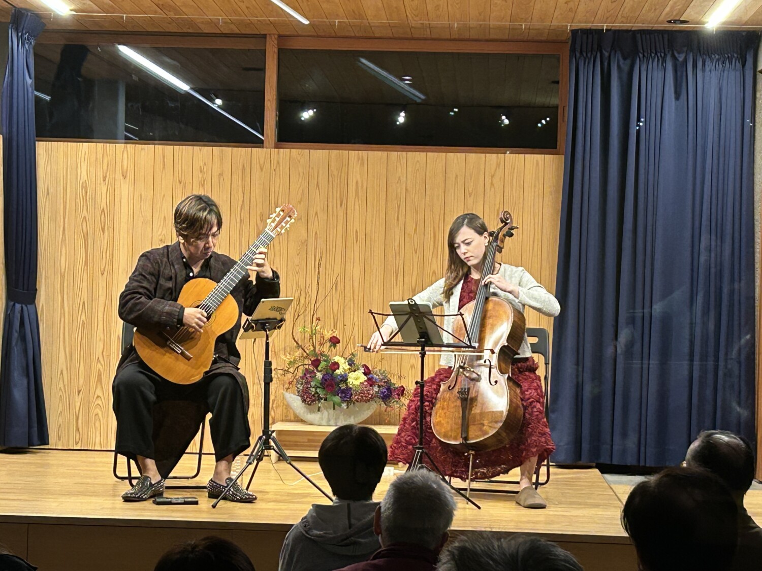 2025年11月10日 ギター&チェロのデュオ、終了です 心が躍る、心に沁みる。 ギターとチェロが奏でるスペイン音楽、山下俊輔×グレイ理沙「はじまりの言葉」〈昼夜2回公演〉が終了しました。 どちらも生音のギターとチェロ、チェロの音にギターの音色が霞んでしまうのではなんて無用な心配だった。噺館の小空間に響く見事に調和した素晴らしい演奏、感動です。 前へ 次へ