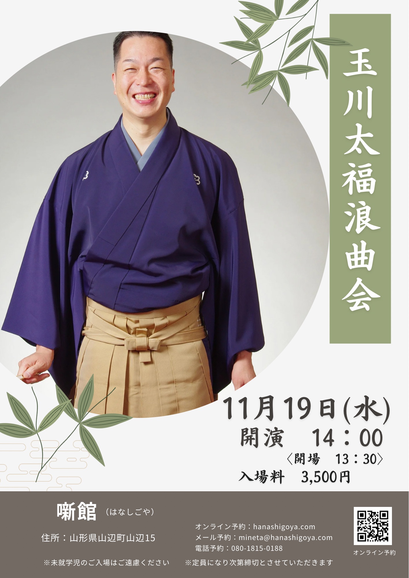 2025年11月14日 来週は浪曲です 噺館、来週11/19(水)は浪曲です。 浪曲は古臭いというイメージありませんか?いま、その浪曲のイメージを変えようとする大注目の浪曲師・玉川太福さんが、約1年半ぶりの登場です。 噺館空間の間近な距離で聴く太福さんの浪曲は、格別です。浪曲に馴染みがない方もぜひ一度聴いてみてください。 前へ 次へ