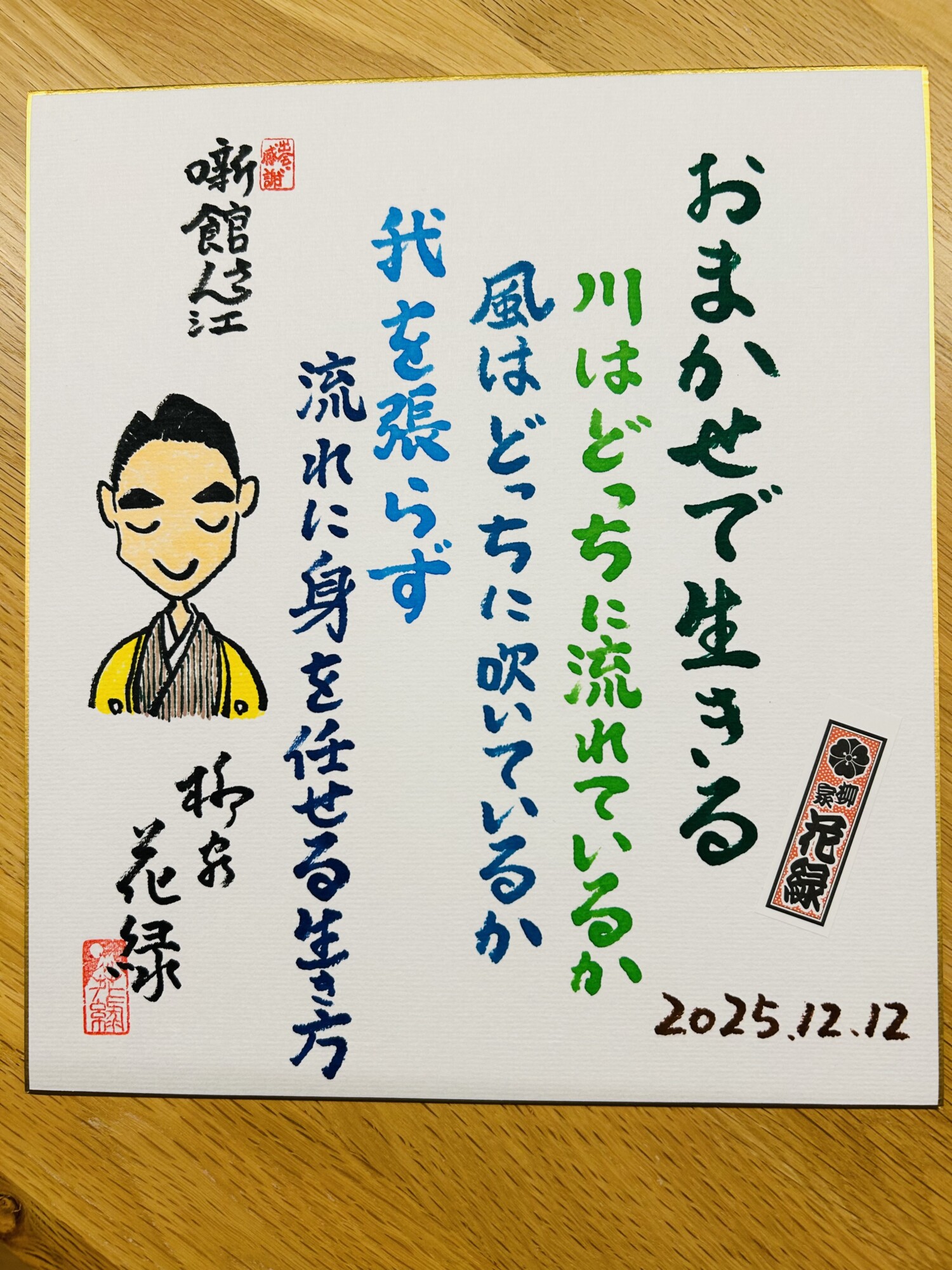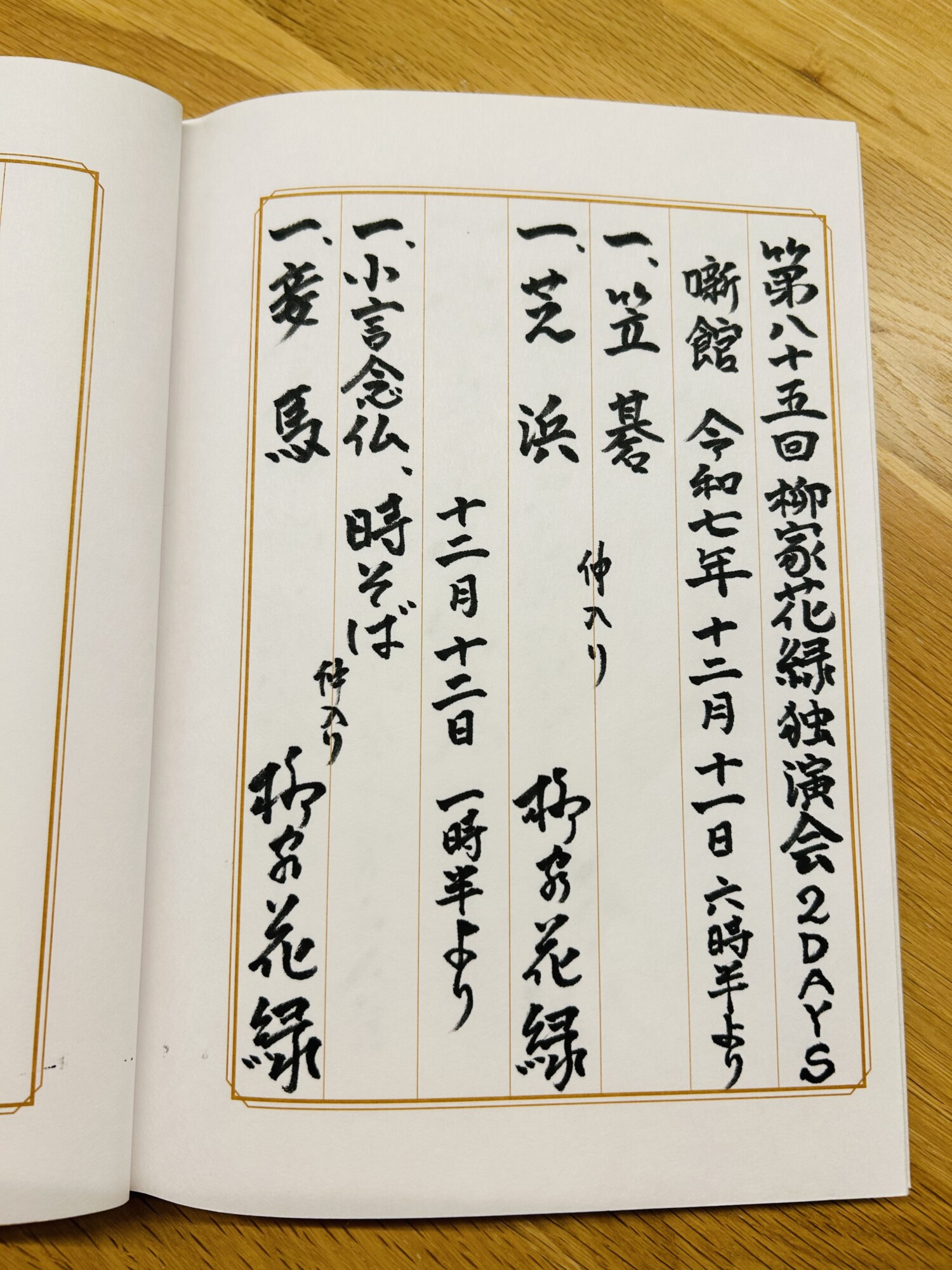 2025年12月12日 「花緑独演会〜2days」終了 連続2日間。 噺館寄席第85回 「 柳家花緑独演会~2DAYS」、無事終了です。 新潟•村上市の落語会プロデューサーの方がお見えでご挨拶をした際、「このぐらいの人数で花緑師匠を聴けるってすごいですね、贅沢ですねー」と。私もそう思います。 あー、終わっちゃったぁー。 前へ 次へ