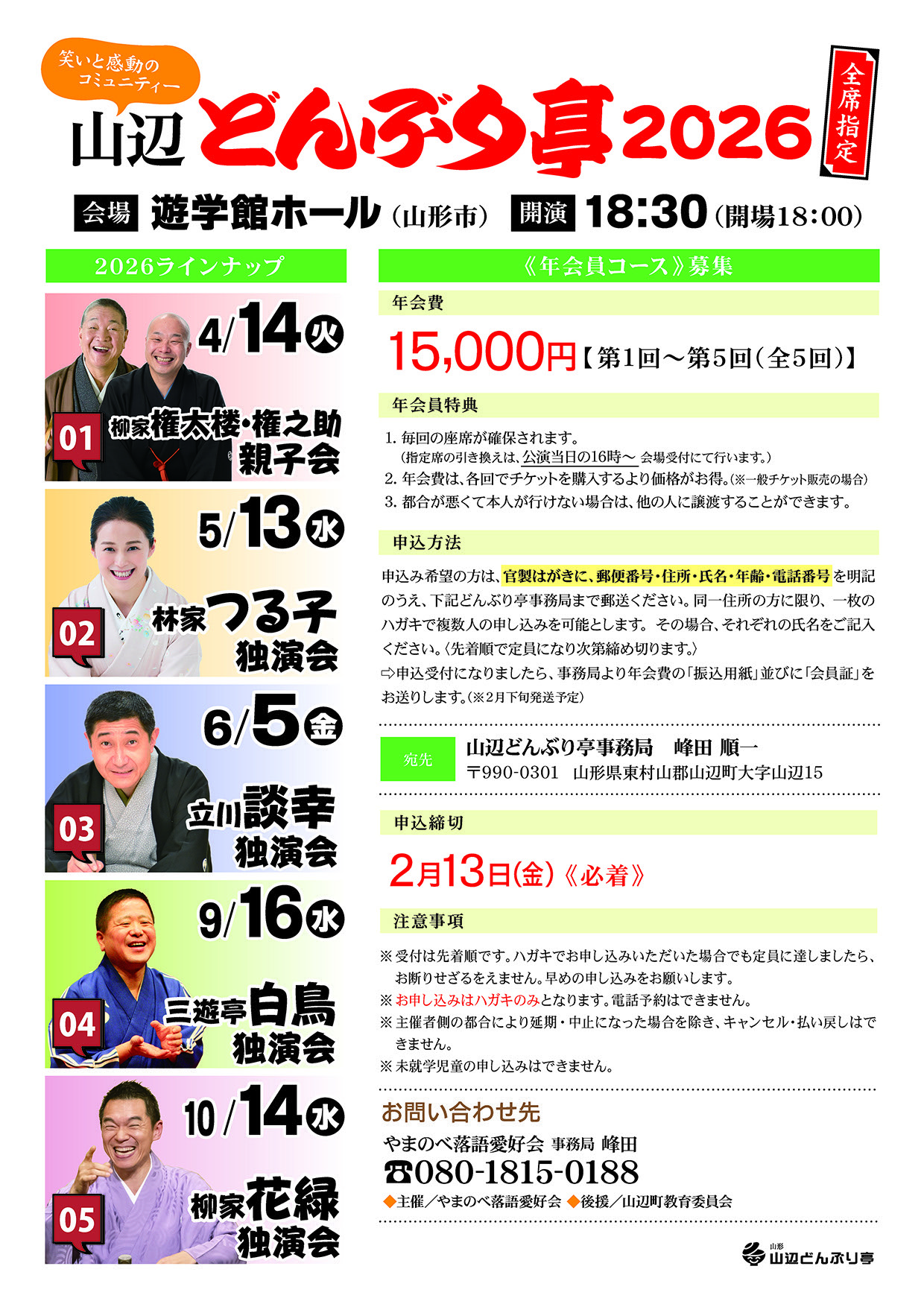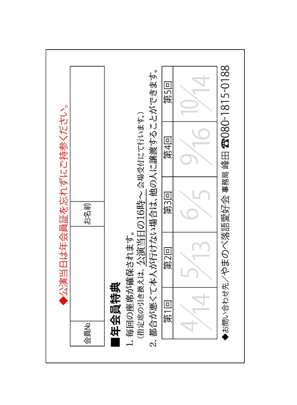 2026年2月26日 「年会員証」発送 新たに「山辺どんぶり亭2026」の年会員になられた方に、年会員証を発送しました。これは私が事務局を務める地域落語会「山辺どんぶり亭」、2月に入り今年の募集を開始、まもなく定員に達し締め切りとなりました。今回、年会員になられた皆様に「年会員証」の発送を無事終え、ようやく一安心といった感じです。今年のどんぶり亭も楽しみです。 前へ 次へ