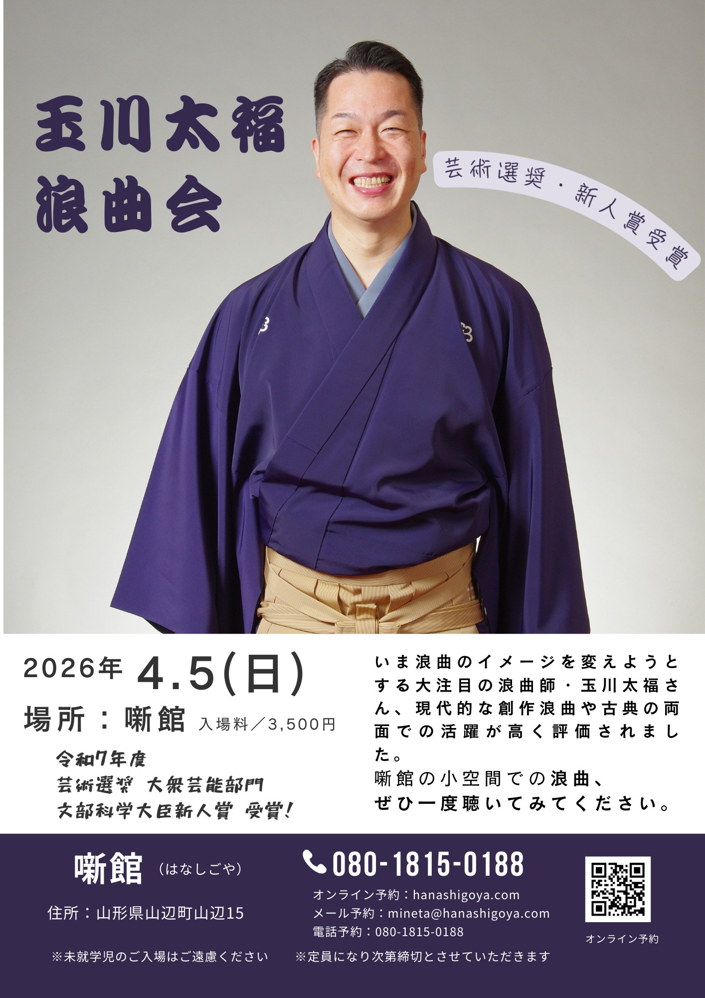 そんな浪曲のイメージを変える注目の浪曲師・玉川太福さんですが、令和7年度芸術選奨において大衆芸能部門の文部科学大臣新人賞を受賞されたという発表があったばかり、現代的な創作浪曲や古典の両面での活躍が高く評価されたとのことです。