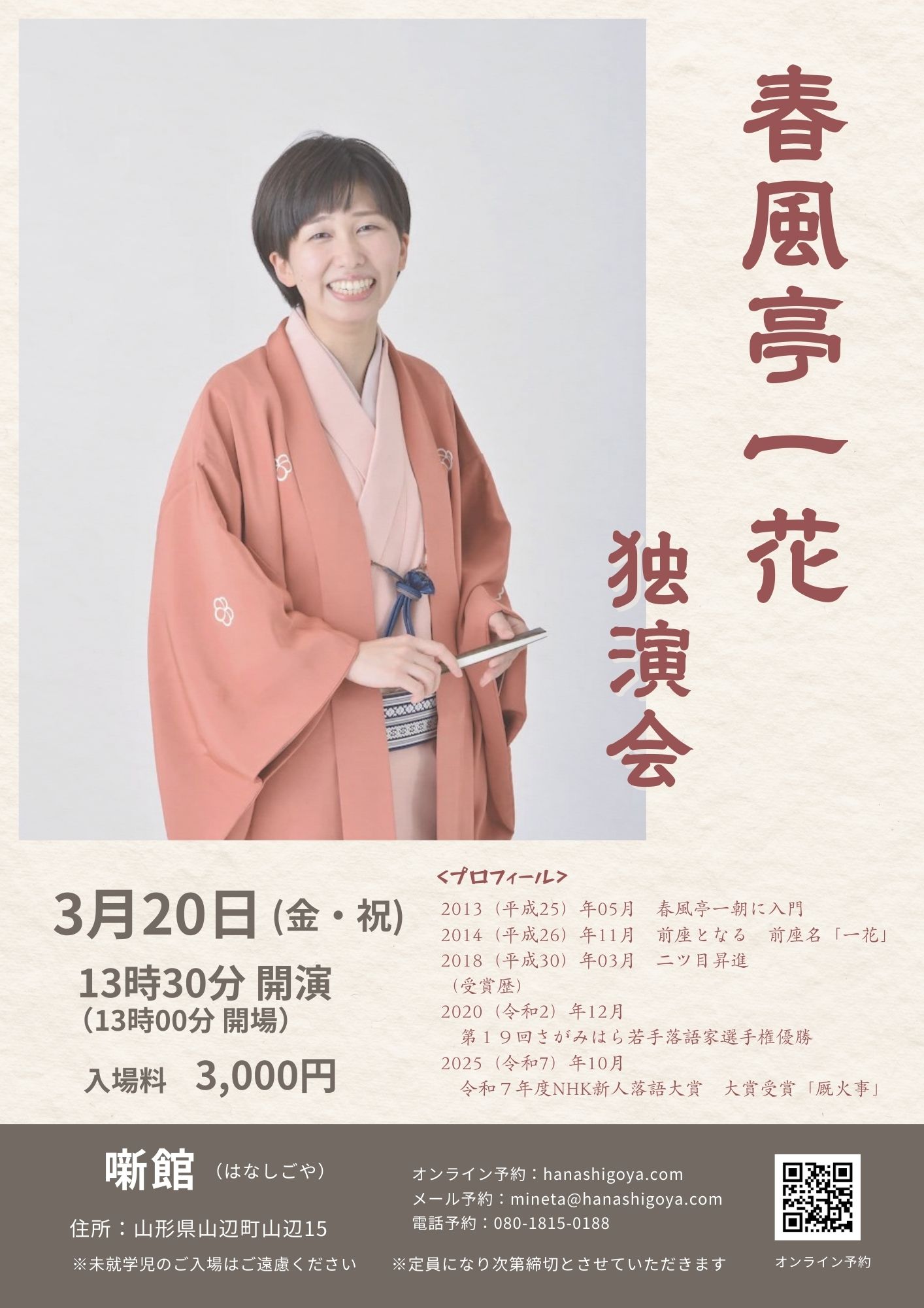 今もっとも勢いのある一花さんの落語を、噺館のこじんまりとした空間でお楽しみください。