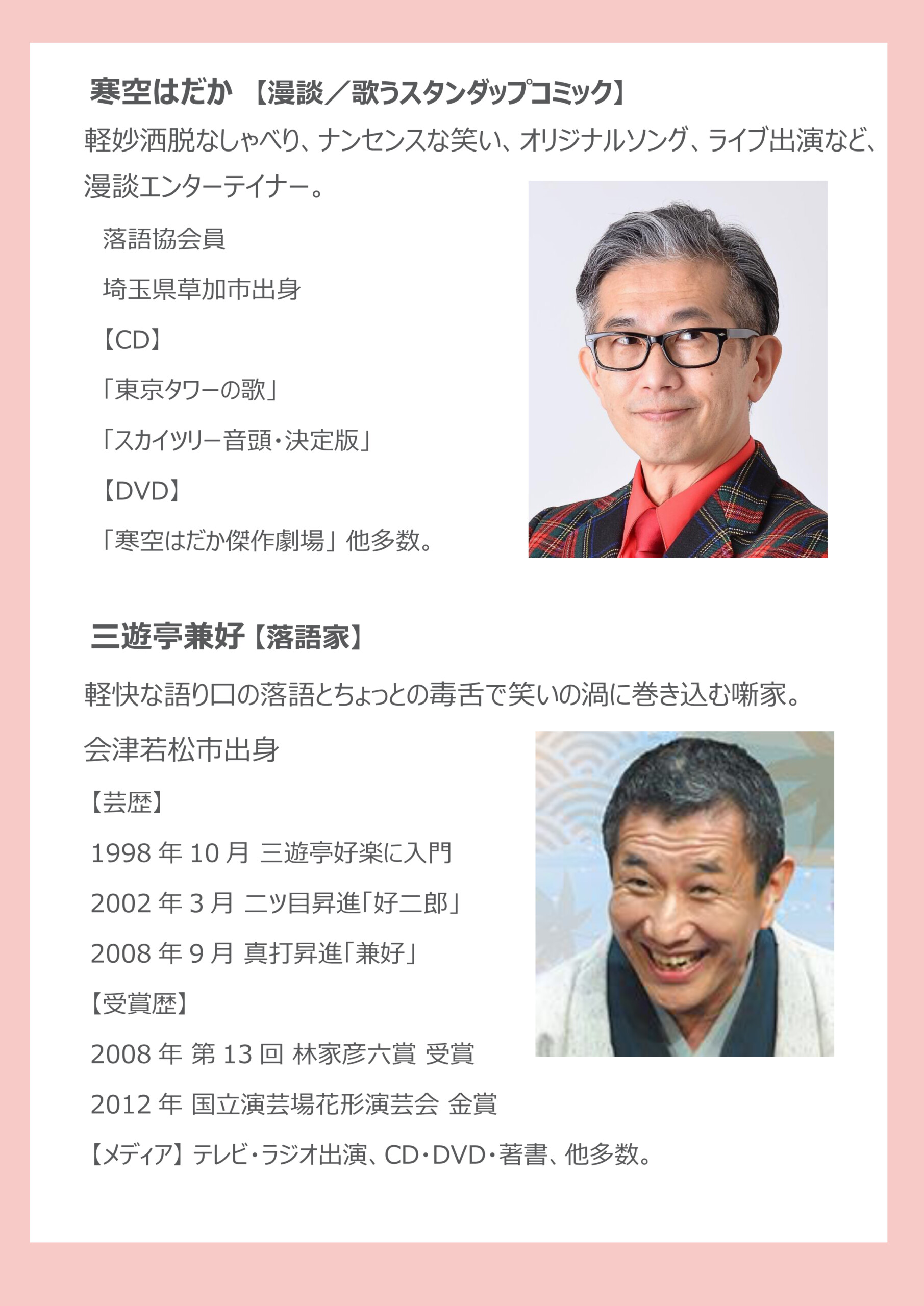 寄席で思わず大笑いしてしまう、エンターティナー寒空はだかさんの漫談、兼好師匠の落語、そしてお二人のトークと、こちらは多才な芸人を同時に楽しめるという贅沢な企画となっています。
